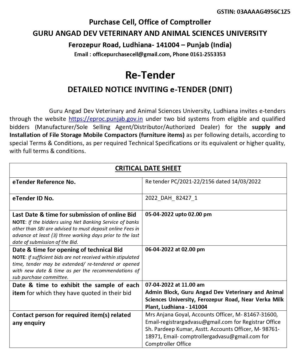 Re-Tender for the supply and installation of File Storage Mobile Compactors (Furniture items), Assistant Store Officer (Purchase), Purchase Cell, O/o Comptroller, GADVASU, Ludhiana