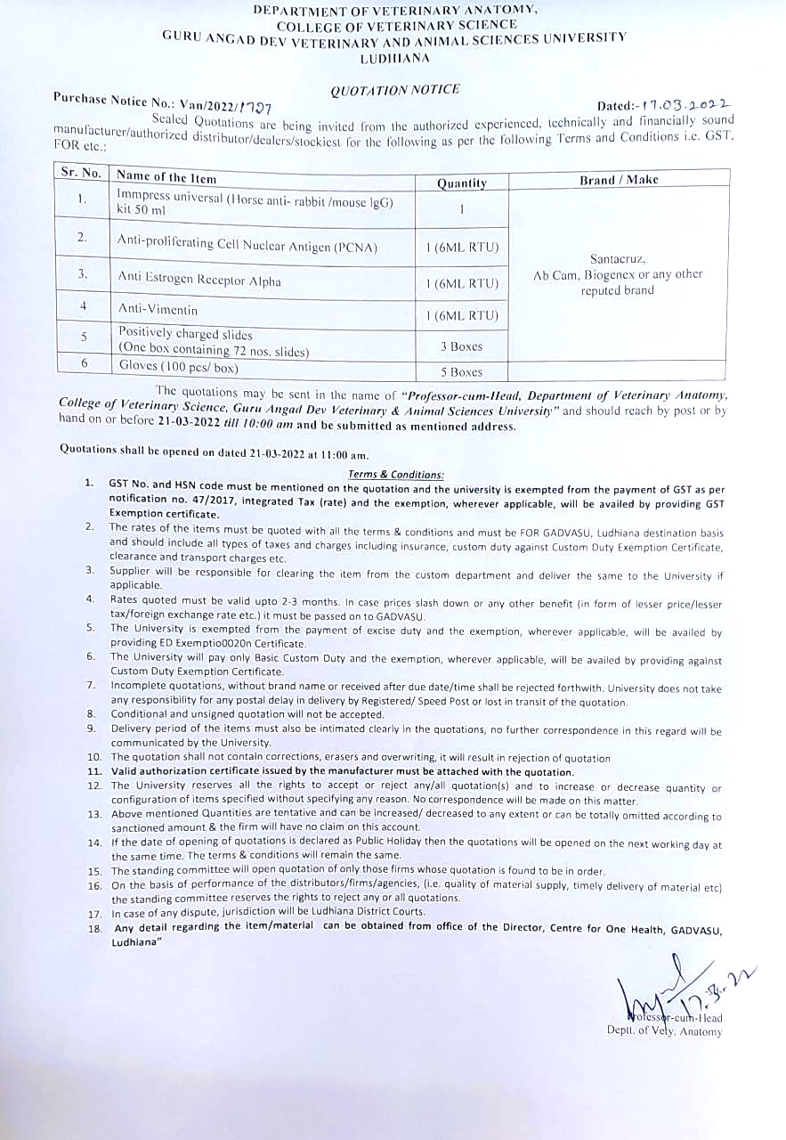 Quotation notice for the supply of various items, Professor-cum-Head, Deptt. of Vety. Anatomy, COVS, GADVASU, Ludhiana