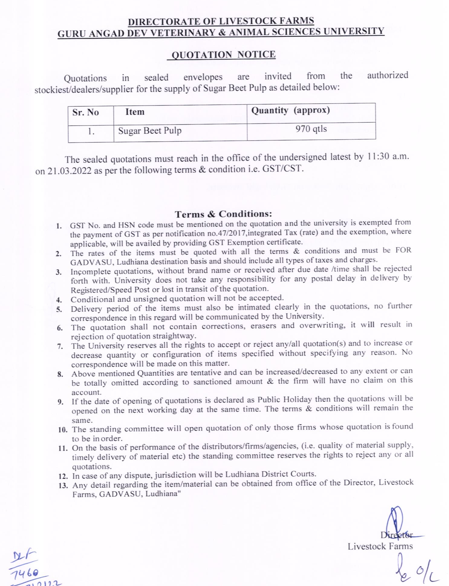 Quotation notice for the supply of Sugar Beet Pulp, Directorate of Livestock Farms, GADVASU, Ludhiana