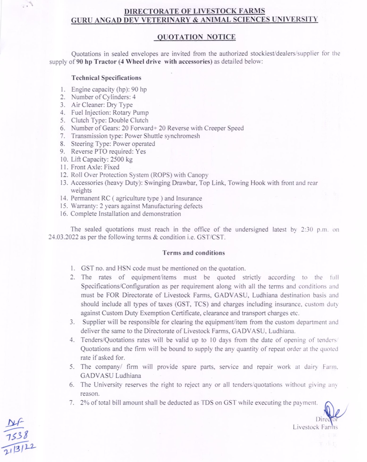 Quotation notice for the purchase of 90hp Tractor (4 wheel drive with accessories), Directorate of Livestock Farms, GADVASU, Ludhiana