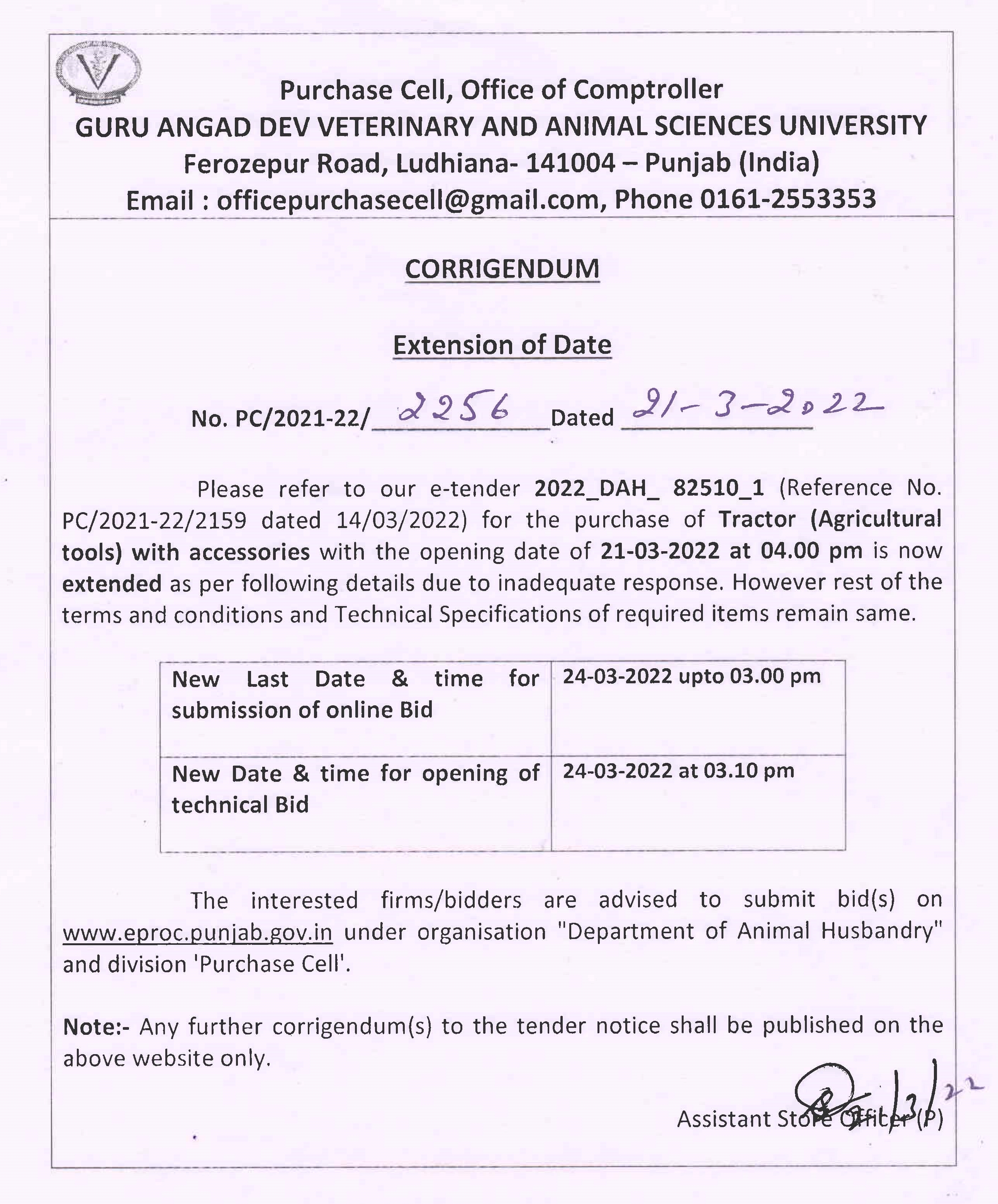 Corrigendum for e-Tender Notice for the Purchase of Tractor (Agriculture Tools), Purchase Cell, O/o Comptroller, GADVASU, Ludhiana