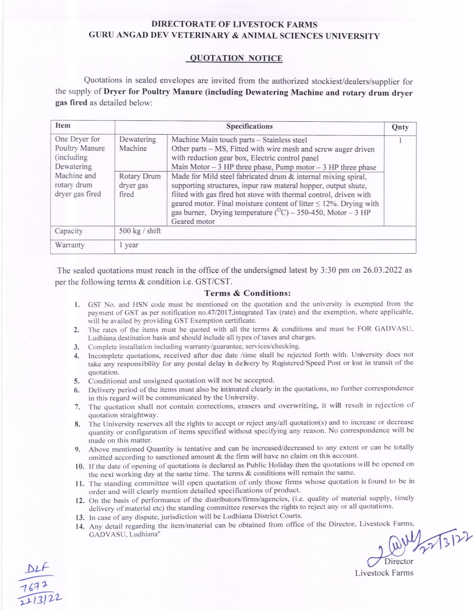 Quotation notice for the supply of Dryer for Poultry Manure, Director, Livestock Farms, GADVASU, Ludhiana