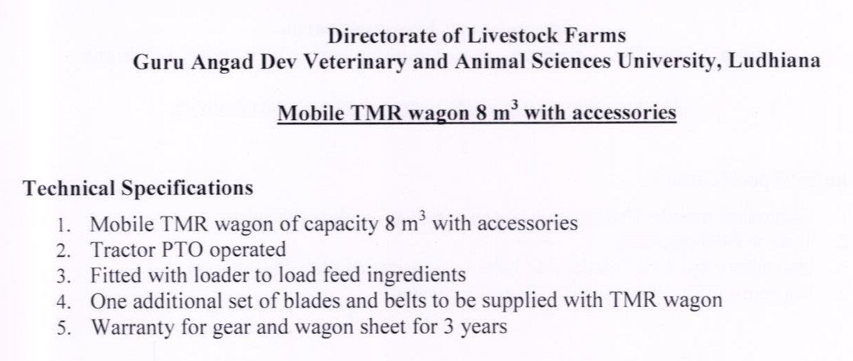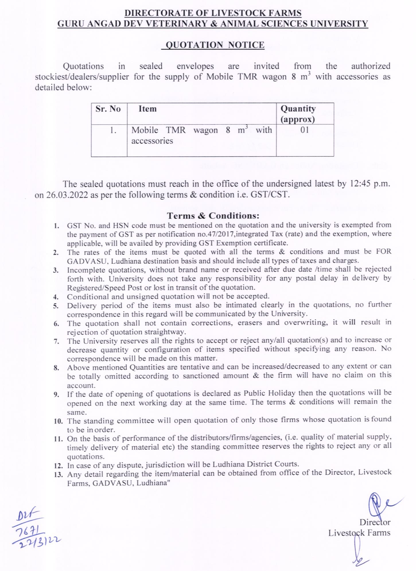 Quotation notice for the supply of Mobile TMR wagon, Director, Livestock Farms, GADVASU, Ludhiana