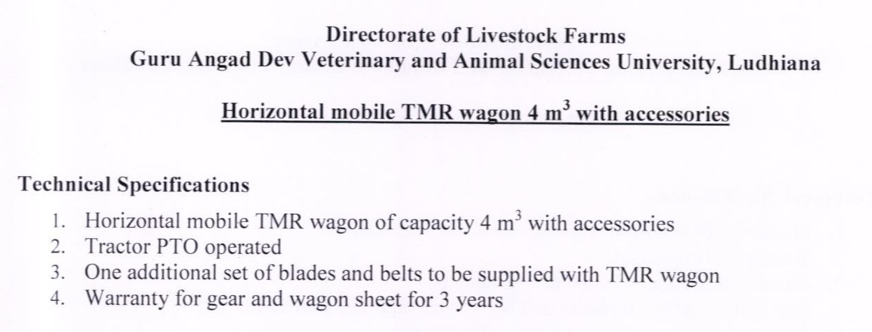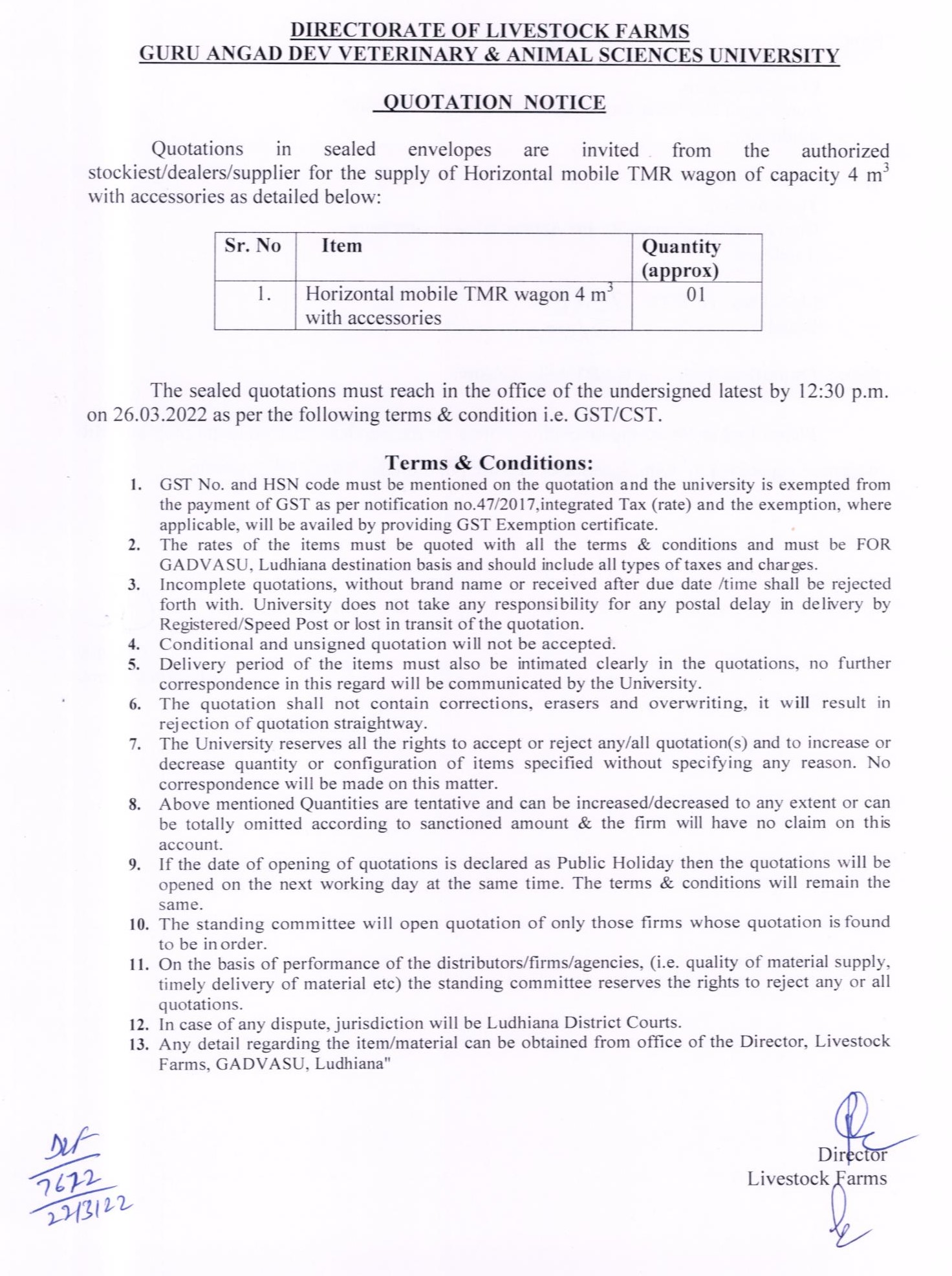 Quotation notice for the supply of Horizontal Mobile TMR wagon, Director, Livestock Farms, GADVASU, Ludhiana