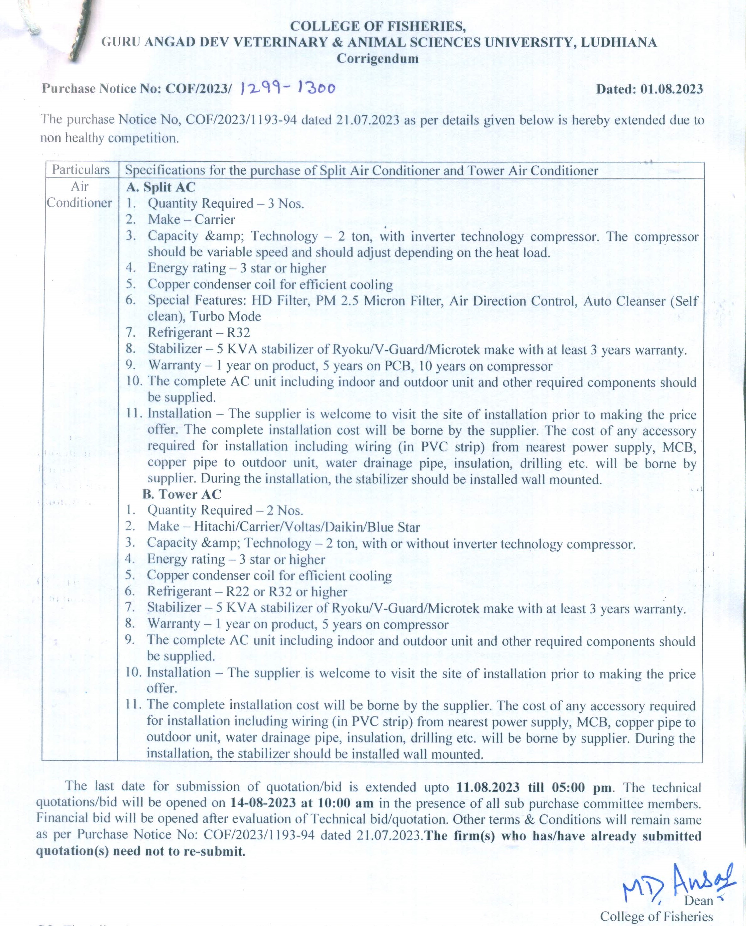 Quotation notice for the purchase of Split Air Conditioner and Tower Air Conditioner, Dean, College of Fisheries, Ludhiana