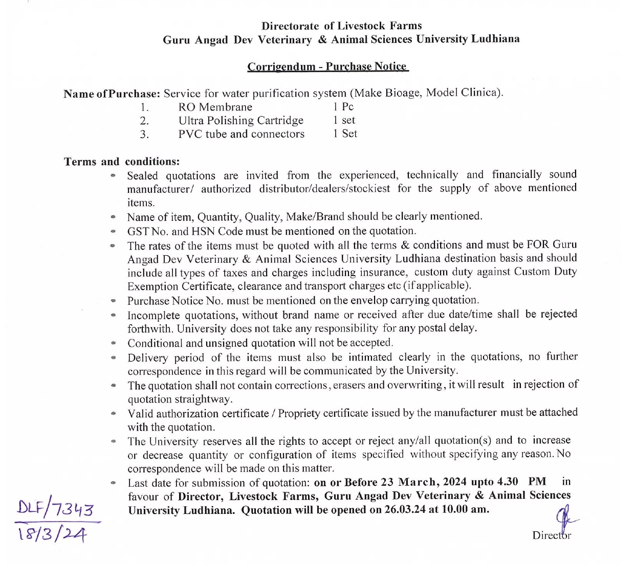 Corrigendum Purchase Notice for Service for Water Purification System (Make Bioage, Model Clinica), Director, Livestock Farms, GADVASU, Ludhiana